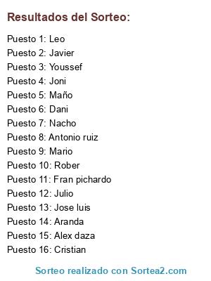 Lista de participantes: Nacho, Jose luis, Mario, Fran pichardo, Aranda, Dani, Youssef, Maño, Alex daza, Joni, Antonio ruiz, Rober, Leo, Julio, Cristian, Javier.