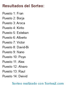 Lista de participantes: Alberto, Victor, Fran, Alvaro, Borja, Nano, Deivid, David-Bi, Kirito, Raul, Poyo, Aroca, Alex, Esteban.