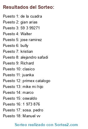 Lista de participantes: Walter, Richard, Manuel vv, mike mi hijo, primex catalogo, bully, alejandro safadi, gian arias, jose ramirez, sosa. pedro, kristian, juanka, oswaldo, marco, 59 3 99271, 1 973 876, de la cuadra, clasico.