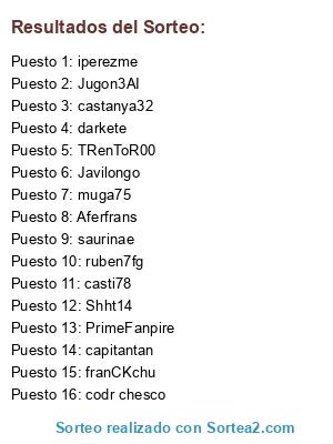 Lista de participantes: casti78, Jugon3AI, PrimeFanpire, Shht14, Javilongo, ruben7fg, darkete, TRenToR00, muga75, capitantan, Aferfrans, codr chesco, castanya32, iperezme, franCKchu, saurinae.