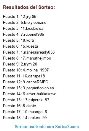 Lista de participantes: 1.nanerasready033, 2.tryml20, 3.pequeñonicolas, 4.molina_1997, 5.brolylobezno, 6.arber-bukkakrew, 7.rubenet986, 8.danic, 9.carlosRMFC, 10.masogo_6, 11.locobielsa, 12.jrg-95, 13.ruiperez_87, 14.crakes_99, 15.kuesta, 16.darupe18, 17.manuthejimbo, 18.korti.