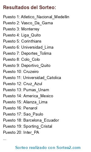 Lista de participantes: anm = Atletico_Nacional_Medellin, cco = Colo_Colo, cer = Cerro_Porteño, cor = Corinthians, cru = Cruzeiro, dqu = Deportivo_Quito, dto = Deportes_Tolima, dth = Deportivo_Tachira, fla = Flamengo, int = Inter_PA, ldq = Liga_Quito, mon = Monterrey, nmo = Nacional_Montevideo, olp = Olimpia_Paraguay, pen = Penarol, pum = Pumas_Unam, sfc = Santos_FC, scr = Sporting_Cristal, uca = Universidad_Catolica, uli = Universidad_Lima, ali = Alianza_Lima, amc = America_Cali, ame = America_Mexico, bar = Barcelona_Ecuador, car = Caracas, caz = Cruz_Azul, dcu = DC_United, dsu = Defensor_Sporting, eme = Emelec, flu = Fluminense, gre = Gremio, jau = Juan_Aurich, lag = Los_Angeles_Galaxy, lib = Libertad_Paraguay, nyr = New_York_Red_Bulls, onc = Once_Caldas, pal = Palmeiras, sao = Sao_Paulo, uch = Universidad_Chile, vdg = Vasco_Da_Gama.