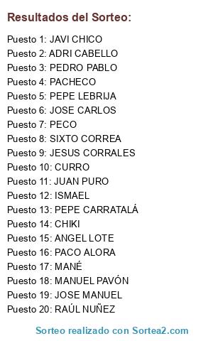 Lista de participantes: PECO, PEPE CARRATALÁ, JUAN PURO, MANÉ, ISMAEL, CHIKI, JESUS CORRALES, JOSE CARLOS, PEPE LEBRIJA, PACO ALORA, PACHECO, PEDRO PABLO, SIXTO CORREA, JAVI CHICO, MANUEL PAVÓN, CURRO, ANGEL LOTE, ADRI CABELLO, JOSE MANUEL, RAÚL NUÑEZ.