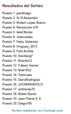 Lista de participantes: Diego195, Arenberg7, Revolución 476, JHOWARAPOLO, Uruguay_2012, Tommaso, Alvarito22, jeanthiago, lalo43forlan, antiheroe75, Joancostas, Jean Pierre G S, DarioRodriguez, Robert Lopez Bueno, Mati1932, Nahu Gutierrez, Fabian Gamer, Martin Barrio, Sr.D Alexandre, Fefo Archila.