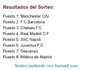 Lista de participantes: SSC Napoli, Manchester City, Real Madrid C.F, F.C Barcelona, Juventus F.C, Chelsea F.C, Atlético de Madrid, Descanso.