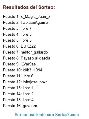 Lista de participantes: hektor_gallardo, k0k3_1994, lokojose_psxr, Payaso al qaeda, iLVar9as, FabiaanAguirre, gavohm, EUKZ22, x_Magic_Juan_x, libre 1, libre 2, libre 3, libre 4, libre 5, libre 6, libre 7, .