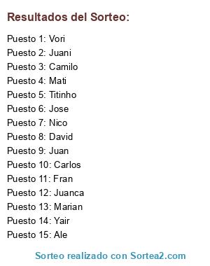 Lista de participantes: Vori, Marian, Juanca, Yair, Mati, Juani, Juan, Carlos, Fran, Jose, Nico, Titinho, David, Ale, Camilo.