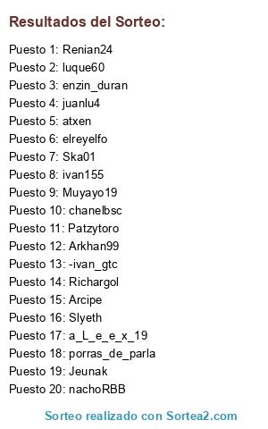 Lista de participantes: Renian24, Arkhan99, ivan155, a_L_e_e_x_19, nachoRBB, atxen, enzin_duran, Jeunak, Patzytoro, porras_de_parla, elreyelfo, chanelbsc, juanlu4, Slyeth, luque60, Ska01, -ivan_gtc, Arcipe, Richargol, Muyayo19.