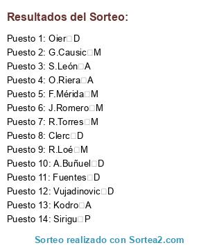 Lista de participantes: A.Buñuel D, Clerc D, F.Mérida M, Fuentes D, G.Causic M, J.Romero M, Kodro A, O.Riera A, Oier D, R.Loé M, R.Torres M, S.León A, Sirigu P, Vujadinovic D.