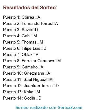 Lista de participantes: Correa A, Fernando Torres A, Ferreira Carrasco M, Filipe Luis D, Gabi M, Gameiro A, Godín D, Griezmann A, Juanfran Torres D, Koke M, Oblak P, Saúl Ñíguez M, Savic D, Thomas M.