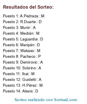 Lista de participantes: A.Pedraza M, Alexis D, Demirovic A, Guidetti A, H.Pérez M, Ibai M, Laguardia D, Maripán D, Medrán M, Munir A, Pacheco P, R.Duarte D, Sobrino A, Wakaso M.