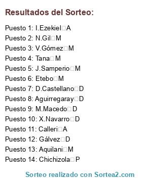 Lista de participantes: Aguirregaray D, Aquilani M, Calleri A, Chichizola P, D.Castellano D, Etebo M, Gálvez D, I.Ezekiel A, J.Samperio M, M.Macedo D, N.Gil M, Tana M, V.Gómez M, X.Navarro D.