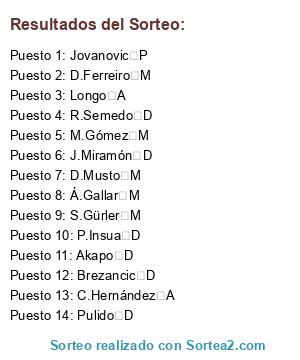 Lista de participantes: Á.Gallar M, Akapo D, Brezancic D, C.Hernández A, D.Ferreiro M, D.Musto M, J.Miramón D, Jovanovic P, Longo A, M.Gómez M, P.Insua D, Pulido D, R.Semedo D, S.Gürler M.