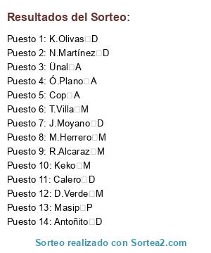 Lista de participantes: Antoñito D, Calero D, Cop A, D.Verde M, J.Moyano D, K.Olivas D, Keko M, M.Herrero M, Masip P, N.Martínez D, Ó.Plano A, R.Alcaraz M, T.Villa M, Ünal A.