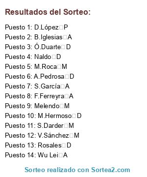 Lista de participantes: A.Pedrosa D, B.Iglesias A, D.López P, F.Ferreyra A, M.Hermoso D, M.Roca M, Melendo M, Naldo D, Ó.Duarte D, Rosales D, S.Darder M, S.García A, V.Sánchez M, Wu Lei A.