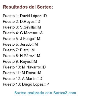 Lista de participantes: A.Martín D, D.Reyes D, David López D, Diego López P, G.Moreno A, H.Pérez M, J.Fuego M, Jurado M, M.Navarro D, M.Roca M, Piatti M, Reyes M, S.Sevilla M.