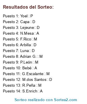 Lista de participantes: Adrian G. M, Arbilla D, Bebé A, Capa D, F.Rico M, G.Escalante M, Lejeune D, Luna D, M.dos Santos D, N.Mesa A, P.León M, R.Peña M, S.Enrich A, Yoel P.