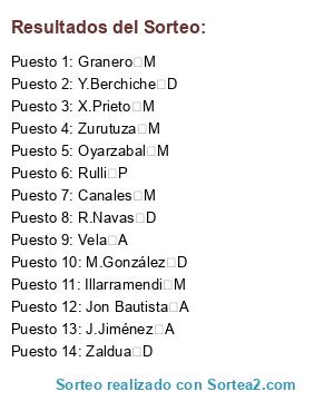 Lista de participantes: Canales M, Granero M, Illarramendi M, J.Jiménez A, Jon Bautista A, M.González D, Oyarzabal M, R.Navas D, Rulli P, Vela A, X.Prieto M, Y.Berchiche D, Zaldua D, Zurutuza M.