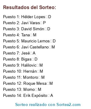 Lista de participantes: Bigas D, David Simón D, Erik Expósito A, Halilovic M, Hélder Lopes D, Hernán M, Javi Castellano M, Javi Varas P, Jesé A, Mauricio Lemos D, Momo M, Montoro M, Roque Mesa M, Tana M.