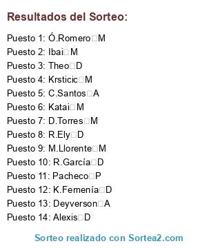 Lista de participantes: Alexis D, C.Santos A, D.Torres M, Deyverson A, Ibai M, K.Femenía D, Katai M, Krsticic M, M.Llorente M, Ó.Romero M, Pacheco P, R.Ely D, R.García D, Theo D.