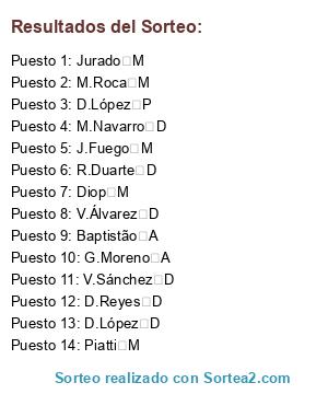 Lista de participantes: Baptistão A, D.López P, D.López D, D.Reyes D, Diop M, G.Moreno A, J.Fuego M, Jurado M, M.Navarro D, M.Roca M, Piatti M, R.Duarte D, V.Álvarez D, V.Sánchez D.