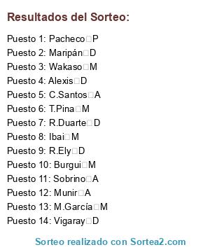 Lista de participantes: Alexis D, Burgui M, C.Santos A, Ibai M, M.García M, Maripán D, Munir A, Pacheco P, R.Ely D, R.Duarte D, Sobrino A, T.Pina M, Vigaray D, Wakaso M.