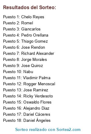 Lista de participantes: Dariel Cáceres, Jose Quiroz, Oswaldo Flores, Jose Rendon, Jose Ramirez, Chelo Reyes, Vladimir Palma, Alejandro Diaz, Daniel Ángeles, Jorge Morales, Giancarlos, Pedro Orellana, Rogger Menoscal, Ricky Verdesoto, Thiago Gomez, Romel, Nabu, Richard Alexander.