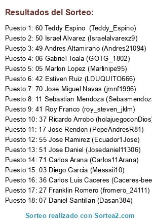 Lista de participantes: 33 Javier Oyervide (Boyervide), 73 Jonathan Acurio (JonAF02), 35 John Arauz (Jhon_ldu), 57 Hector Benitez (hector121090), 78 Jose Garcia (Gabu199024), 81 David Licoa (DavisitoL85), 83 Kristian Espinoza (Ilegal), 84 Christian Vera (Cmarcelo93_), 85 Carlos Jaramillo (Edu_Jr11), 15 Miguel Mora (Sucomora80), 61 Xavier Baculima (El_TwistO), 32 Mauricio Quiridunbay (Mautrixio), 43 Alvaro Sanchez (Lilactico23), 47 Jose Flores (JRFA84), 86 Carlos Gurumendi (Gurumendi-7), 67 Bolivar Parra (fortesque1993).