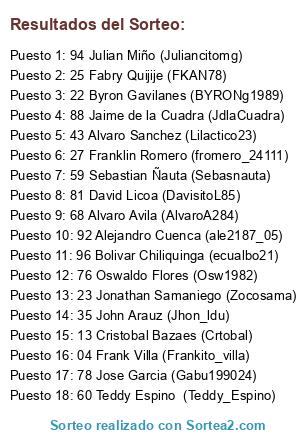 Lista de participantes: 25 Fabry Quijije (FKAN78), 22 Byron Gavilanes (BYRONg1989), 76 Oswaldo Flores (Osw1982), 68 Alvaro Avila (AlvaroA284), 59 Sebastian Ñauta (Sebasnauta), 81 David Licoa (DavisitoL85), 23 Jonathan Samaniego (Zocosama), 04 Frank Villa (Frankito_villa), 96 Bolivar Chiliquinga (ecualbo21), 27 Franklin Romero (fromero_24111), 60 Teddy Espino (Teddy_Espino), 35 John Arauz (Jhon_ldu), 78 Jose Garcia (Gabu199024), 43 Alvaro Sanchez (Lilactico23), 88 Jaime de la Cuadra (JdlaCuadra), 92 Alejandro Cuenca (ale2187_05), 13 Cristobal Bazaes (Crtobal), 94 Julian Miño (Juliancitomg).