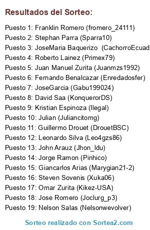 Lista de participantes: Jorge Ramon (Pinhico), David Saa (KonquerorDS), John Arauz (Jhon_ldu), Giancarlos Arias (Marygian21-2), Leonardo Silva (Leo4gzs86), Nelson Salas (Nelsonwevolver), JoseMaria Baquerizo (CachorroEcuador), Roberto Lainez (Primex79), Steven Sovenis (Xuka06), Stephan Parra (Sparra10), Guillermo Drouet (DrouetBSC), Fernando Benalcazar (Enredadosfer), Omar Zurita (Kikez-USA), Julian (Juliancitomg), JoseGarcia (Gabu199024), Jose Romero (Joclurg_p3), Franklin Romero (fromero_24111), Juan Manuel Zurita (Juanmzs1992), Kristian Espinoza (Ilegal).