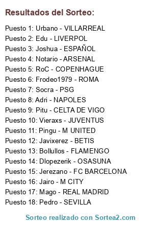 Lista de participantes: Adri - NAPOLES, Pingu - M UNITED, Javixerez - BETIS, Jerezano - FC BARCELONA, Jairo - M CITY, Urbano - VILLARREAL, Joshua - ESPAÑOL, Bollullos - FLAMENGO, Edu - LIVERPOL, Pitu - CELTA DE VIGO, Vieraxs - JUVENTUS, Dlopezerik - OSASUNA, Socra - PSG, Frodeo1979 - ROMA, RoC - COPENHAGUE, Mago - REAL MADRID, Pedro - SEVILLA, Notario - ARSENAL.