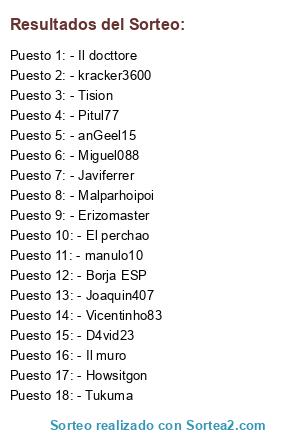 Lista de participantes: oX Hate Xo, Elkonejito, Vicentinho83, D4vid23, Miguel088, Tukuma, anGeel15, kracker3600, Borja ESP, Erizomaster, Howsitgon, Javiferrer, Joaquin407, Il muro, Malparhoipoi, Tision, Pitul77, El perchao, Il docttore, manulo10.