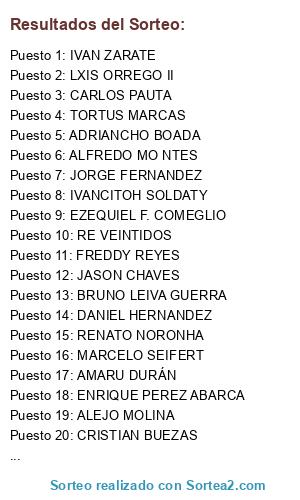 Lista de participantes: ADRIANCHO BOADA, ALEJANDRO VOUILLOUD, ALEJO MOLINA, ALEXANDER MORA, ALFREDO MO NTES, AMARU DURÁN, BENJA CASTILLO, BRANDON ORTIZ MUÑOZ, BRUNO LEIVA GUERRA, CARLOS PAUTA, CRISTIAN BUEZAS, CRISTIAN CORREA, DANIEL HERNANDEZ, DAVID BENAVIDEZ REYES, EMANUEL TOLEDO, EMI MANSILLA CAB, ENRIQUE PEREZ ABARCA, EZEQUIEL F. COMEGLIO, FABIAN C. GUERRA, FREDDY REYES, GARED SPARTAN, HAWY G A, HUGO ENRIQUE, ISMAEL ANZULES JUNIORS, IVAN LEZANO, IVAN ZARATE, IVANCITOH SOLDATY, JASON CHAVES, JORGE FERNANDEZ, JOSE BASANTES, JUAN PES CEPEDA, LEA SEBAS, LEANDRO LUNA, LUCIANO S. SANMARCO, LUIS GONZALEZ, LXIS ORREGO II, MANUEL QUILES RC, MARCELO SEIFERT, MARCO CORVALAN, MAXIMILIANO FRANCIOLI, MIKE C. LIZARRAGA, NICO RIO, PABLO ADRIAN DUARTE, PEDRO LUCATELES, RAFA VF, RE VEINTIDOS, RENATO NORONHA, SEBASTIAN P. ZAMORANO, TORTUS MARCAS, WALTERZITHO CLAROS, DARIO SEBASTIAN PASINI, CRISTIAN ACUÑA FONSECA, FERNANDO CANO, IVAN SANCHEZ DIAZ, LUIS M. ROBLES COLLANTES, MATIAS RIOS, STEVEN GIARRIZZO, JUAN IGNACIO, PAULO MENDEZ, AGUSTIN SNIADOWSKI.