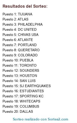 Lista de participantes: SAN LUIS, SOUNDERS, WHITECAPS, ATLANTE, ATLAS, TIJUANA, COLUMBUS, DALLAS, COLORADO, SPORTING KC, TORONTO, CHIVAS USA, DC UNITED, PHILADELPHIA, PORTLAND, PUEBLA, SJ EARTHQUAKES, QUERETARO, HOUSTON, ESTUDIANTES.