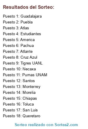 Lista de participantes: America, Atlas, Atlante, Toluca, Guadalajara, Estudiantes, Morelia, Cruz Azul, Pumas UNAM, Santos, Queretaro, Necaxa, Chiapas, Puebla, Pachua, Monterrey, Tigres UANL, San Luis.