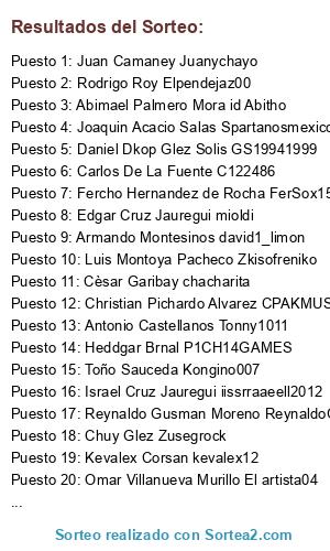 Lista de participantes: Rodrigo Roy Elpendejaz00, Daniel Dkop Glez Solis GS19941999, Chuy Glez Zusegrock, Kevalex Corsan kevalex12, Christian Pichardo Alvarez CPAKMUSP1CHARDO, Toño Sauceda Kongino007, Luis Montoya Pacheco Zkisofreniko, Cèsar Garibay chacharita, Fercho Hernandez de Rocha FerSox1510, Omar Villanueva Murillo El artista04, Javier Perez xavigong, Joaquin Acacio Salas Spartanosmexico, Armando Montesinos david1_limon, Edgar Cruz Jauregui mioldi, Israel Cruz Jauregui iissrraaeell2012, Heddgar Brnal P1CH14GAMES, Carlos De La Fuente C122486, Abimael Palmero Mora id Abitho, Juan Camaney Juanychayo, Reynaldo Gusman Moreno ReynaldoGM, Julio Fernando Sanchez Ramos Fer_n03, Antonio Castellanos Tonny1011.