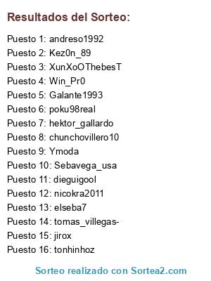 Lista de participantes: XunXoOThebesT, Ymoda, jirox, andreso1992, nicokra2011, Win_Pr0, Kez0n_89, Galante1993, Sebavega_usa, elseba7, tonhinhoz, chunchovillero10, poku98real, dieguigool, hektor_gallardo, tomas_villegas-.