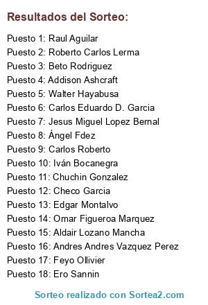 Lista de participantes: Iván Bocanegra, Roberto Carlos Lerma, Raul Aguilar, Walter Hayabusa, Aldair Lozano Mancha, Edgar Montalvo, Beto Rodriguez, Addison Ashcraft, Chuchin Gonzalez, Omar Figueroa Marquez, Ángel Fdez, Feyo Ollivier, Carlos Roberto, Carlos Eduardo D. Garcia, Checo Garcia, Ero Sannin, Jesus Miguel Lopez Bernal, Andres Andres Vazquez Perez.