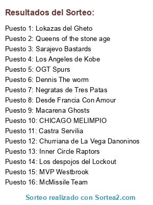 Lista de participantes: Negratas de Tres Patas, Lokazas del Gheto, Desde Francia Con Amour, Inner Circle Raptors, Castra Servilia, Los Angeles de Kobe, Los despojos del Lockout, Queens of the stone age, Macarena Ghosts, MVP Westbrook, Churriana de La Vega Danoninos, OGT Spurs, Sarajevo Bastards, McMissile Team, CHICAGO MELIMPIO, Dennis The worm.