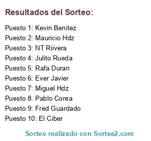 Lista de participantes: Kevin Benitez, Fred Guardado, Julito Rueda, El Ciber, Pablo Corea, NT Riivera, Miguel Hdz, Mauricio Hdz, Ever Javier, Rafa Duran.