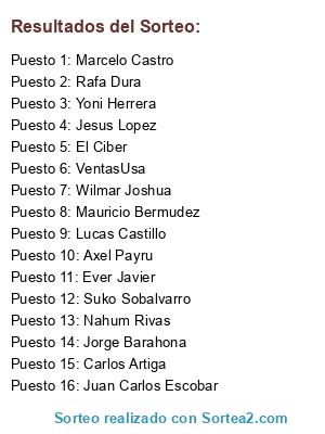 Lista de participantes: Rafa Dura, VentasUsa, Ever Javier, Nahum Rivas, Mauricio Bermudez, Suko Sobalvarro, Lucas Castillo, Juan Carlos Escobar, Yoni Herrera, Wilmar Joshua, Jesus Lopez, Axel Payru, Carlos Artiga, Marcelo Castro, Jorge Barahona, El Ciber.