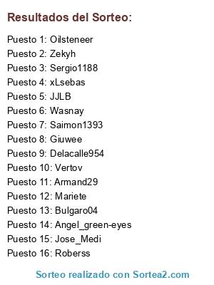 Lista de participantes: Sergio1188, Delacalle954, Oilsteneer, Roberss, Angel_green-eyes, JJLB, Giuwee, Wasnay, Zekyh, Vertov, Bulgaro04, Jose_Medi, Saimon1393, xLsebas, Mariete, Armand29.