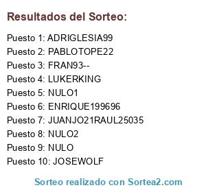Lista de participantes: PABLOTOPE22, ADRIGLESIA99, JOSEWOLF, LUKERKING, FRAN93--, ENRIQUE199696, JUANJO21RAUL25035, NULO, NULO1, NULO2.