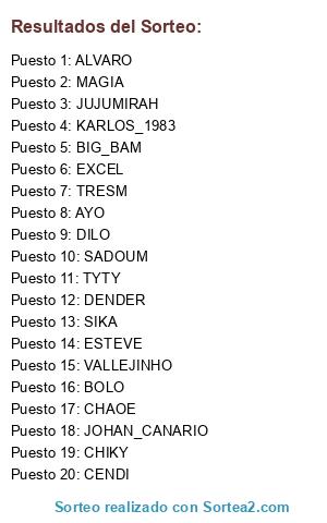 Lista de participantes: ALVARO, AYO, BOLO, CENDI, CHAOE, CHIKY, DILO, JOHAN_CANARIO, TYTY, ESTEVE, EXCEL, KARLOS_1983, JUJUMIRAH, MAGIA, DENDER, SADOUM, SIKA, BIG_BAM, TRESM, VALLEJINHO.