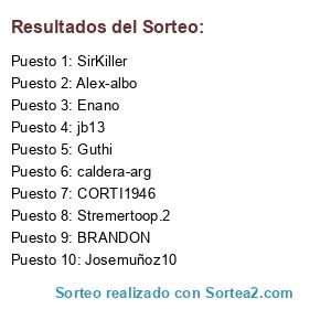 Lista de participantes: CORTI1946, Guthi, SirKiller, BRANDON, Stremertoop.2, Enano, Josemuñoz10, Alex-albo, jb13, caldera-arg.