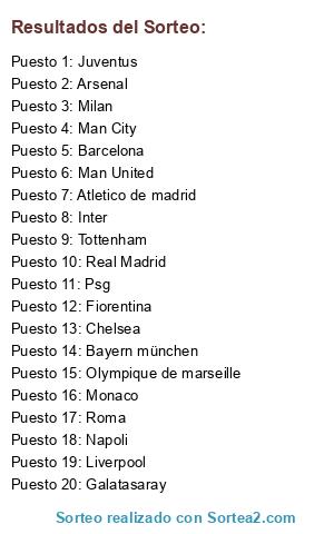 Lista de participantes: Barcelona , Real Madrid , Juventus , Man United , Psg , Chelsea , Bayern münchen , Man City , Arsenal , Inter , Milan , Fiorentina , Roma , Tottenham , Napoli , Liverpool , Olympique de marseille , Galatasaray , Monaco , Atletico de madrid.