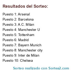 Lista de participantes: Barcelona, Madrid, Chelsea, Manchester U, Manchester city, Arsenal, Tottenham, Bayern Munich, A.C. Milan, Inter de Milan.