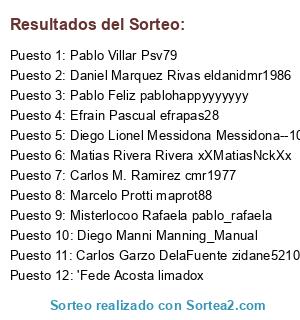 Lista de participantes: Pablo Feliz pablohappyyyyyyy, Marcelo Protti maprot88, Misterlocoo Rafaela pablo_rafaela, Carlos M. Ramirez cmr1977, Pablo Villar Psv79, Efrain Pascual efrapas28, Daniel Marquez Rivas eldanidmr1986, Carlos Garzo DelaFuente zidane5210, Diego Lionel Messidona Messidona--10--, Matias Rivera Rivera xXMatiasNckXx, Diego Manni Manning_Manual, 'Fede Acosta limadox.