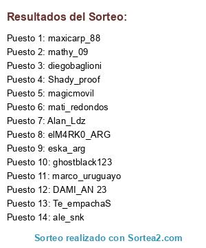 Lista de participantes: marco_uruguayo, mathy_09, magicmovil, diegobaglioni, mati_redondos, Shady_proof, maxicarp_88, Alan_Ldz, Te_empachaS, DAMI_AN 23, ghostblack123, elM4RK0_ARG, ale_snk, eska_arg.