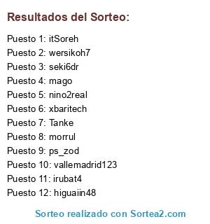 Lista de participantes: irubat4, xbaritech, nino2real, mago, morrul, higuaiin48, seki6dr, Tanke, wersikoh7, ps_zod, itSoreh, vallemadrid123.